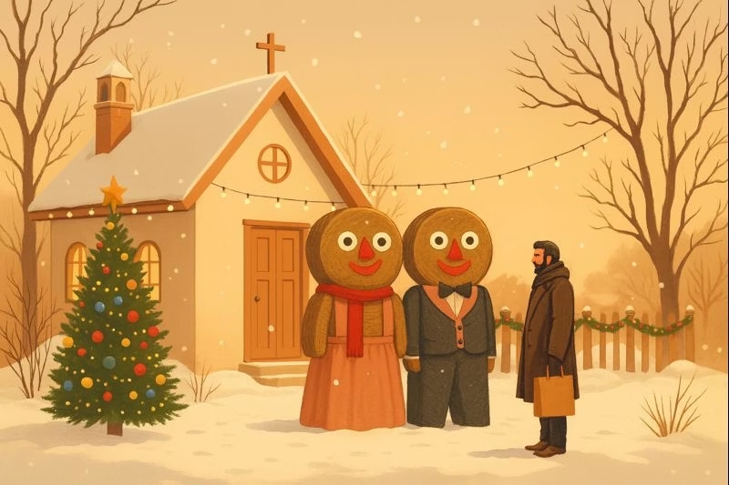 Als sie die Scheunentür öffneten, trauten sie ihren Augen kaum: Jakob und Adele standen mitten im Raum - unversehrt, aber neu geschmückt. Um sie herum eine fröhliche Gruppe Dorfkinder